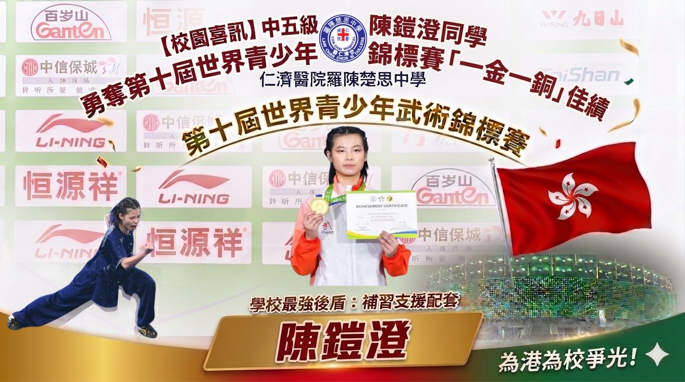 我校中五級陳鎧澄同學代表港隊,遠赴天津出戰「第十屆世界青少年武術錦標賽」,在78個國家強手林立下表現卓越,勇奪女子青年組團體金牌及南拳銅牌,為港為校爭光。今屆賽事乃全球青少年武術盛事,港隊表現神勇,高踞獎牌榜首位。陳同學平日需應付密集訓練,為了讓她兼顧學業,學校特別安排了專業補習及課後輔導,以「雙軌發展」模式全力支援。校長及師生對此輝煌成就感到無比自豪,期盼全體同學以鎧澄為榜樣,發揮「羅中人」追求卓越的精神。